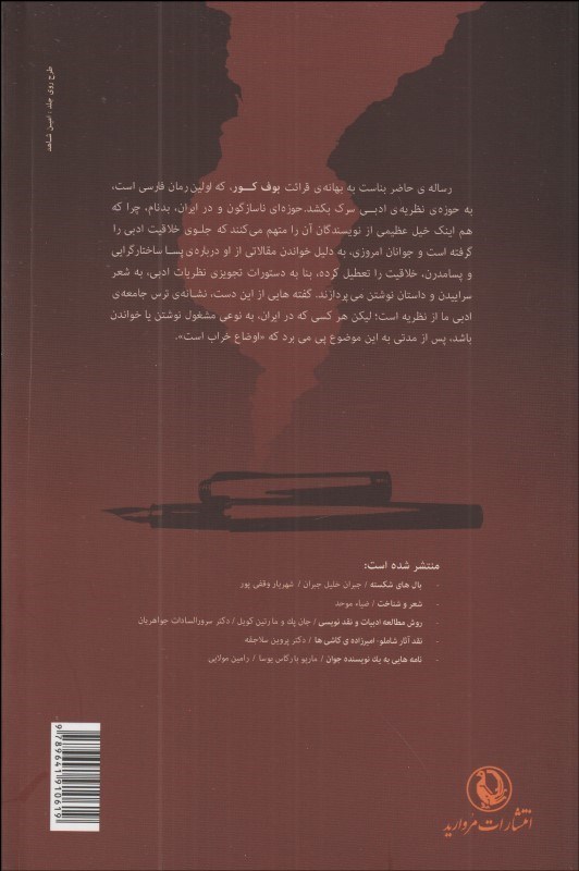 رساله حاضر بناست به بهانه قرائت بوف كور، كه اولين رمان فارسي است، به حوزه نظريه ادبي سرك بكشد. حوزهاي ناسازگون و در ايران، بدنام، چرا كه هم اينك خيلي عظيمي از نويسندگان آن متهم ميكنند كه جلوي خلاقيت ادبي را گرفته است و جوانان امروزي، به دليل خواندن مقالاتي از او درباره پساساختارگرايي و پسامدرن، خلاقيت را تعطيل كرده، بنا به دستورات تجويزي نظريات ادبي، به شعر سراييدن و داستان نوشتن ميپردازند. گفتههايي از اين دست، نشانه ترس جامعه ادبي ما از نظريه است؛ ليكن هر كسي كه در ايران، به نوعي مشغول نوشتن يا خواندن باشد، پس از مدتي به اين موضوع پي ميبرد كه "اوضاع خراب است".