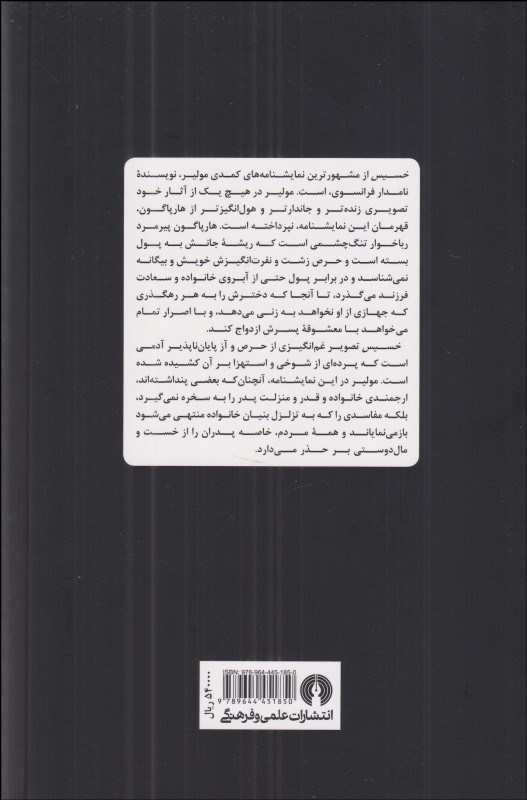 خسيس تصوير غمانگيزي از حرص و آز پايانناپذير آدمي است كه پردهاي از شوخي و استهزا بر آن كشيده شده است. مولير در اين نمايشنامه، آنچنانكه بعضي پنداشتهاند، ارجمندي خانواده و قدر و منزلت پدر را به سخريه نميگيرد، بلكه مفاسدي را كه به تزلزل بنيان خانواده ميپيوندد باز مينمايد و همه مردم، خاصه پدران، را از خست و مالدوستي بر حذر ميدارد.