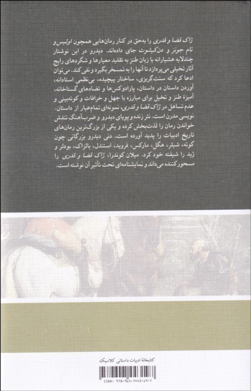 در اين نوشتار چند لايه ديدرو هشيارانه با زبان طنز به تقليد معيارها و شگردهاي معمول آثار تخيلي ميپردازد تا آنها را به تمسخر بگيرد و نفي كند. ميتوان ادعا كرد كه سنتگريزي، ساختار پيچيده بينظمي استادانه، آوردن داستان در داستان، پارادوكسها و تضادهاي گستاخانه، آميزه طنز و تخيل براي مبارزه با جهل و خرافات و كوتهبيني و عدم تساهل در ژاك قضا و قدري، نمونهاي از داستاننويسي مدرن است.