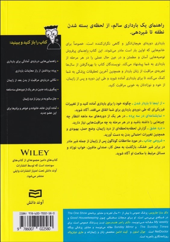 بارداري دورهاي هيجانانگيز و گاهي نگرانكننده است، خصوصا براي خانمهايي كه اولين بار است مادر ميشوند. اين كتاب راهنماي پرفروش توصيههايي آسان و مطمئن و در عين حال عملي را در هر مرحله از بارداري به شما پيشنهاد ميكند. نويسندگان كتاب با بهره گرفتن از سالها تجربه مراقبت از زنان باردار و همچنين آخرين تحقيقات پزشكي به شما كمك ميكنند تا براي بارداري آماده شويد و طي اين دوره و پس از زايمان، از خود و نوزادتان به خوبي مراقبت كنيد.
