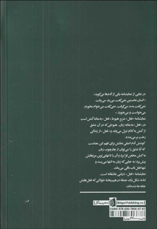 در جايي از نمايشنامه يكي از آدمها ميگويد: «انسان نخستين نميگفت، ميرم، ميرفت. نميگفت بده، ميگرفت. نميگفت ميخوام بخورم، ميخواست و ميخورد.» نمايشنامه «فعل» شرح هبوط «فعل» به مثابه كنش است در «فعل» به مثابه زبان. هبوطي كه در آن عشق از كنش به كلام تنزل مييابد و «فعل» از زندگي رخت بر ميبندد. كوشش آدم اصلي نمايش براي فهم اين معناست كه آيا عشق را ميتوان از چارچوب زبان به كنش محض فرا برد و آن را تا نهاييترين مرزهايش پيش برد؛ به جايي كه زبان به انتها ميرسد و تنها فعل ناب باقي ميماند. نمايشنامه «فعل» درامي عاشقانه است، اما به شكل يك جمله درهم ريخته طولاني كه فعلهايش جابجا شدهاند.
