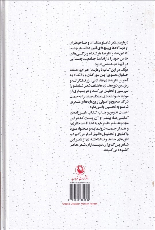 مولف در اين كتاب با رعايت احترام و حفظ حقوق معنوي اين بزرگان و با اتكاء به آخرين نظريههاي نقد ادبي، ژرفنگرانه و ريزبين دورههاي مختلف شعر شاملو را بررسي و تحليل ميكند و در بسياري از موارد خواننده علاقهمند را به جهت درك صحيح و اصولي از بنمايههاي شعر شاملو به تحسين وا ميدارد.